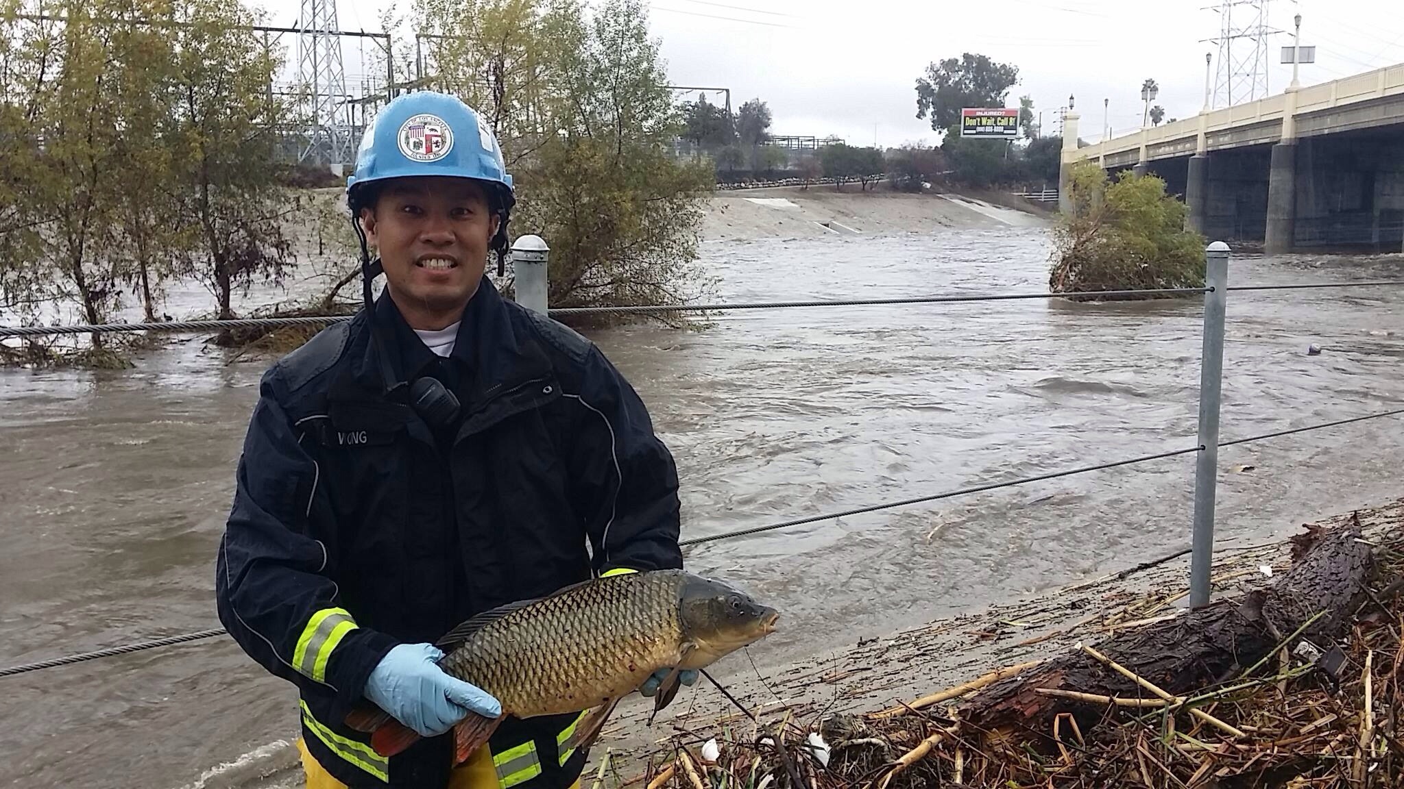 Here’s a typical beauty shot, seen in fly-fishing mags in shops across America. But, this isn’t catch and release. It’s a true lifesaver as L.A. environmental Compliance Inspector Howard Wong rescues this sweet carp and three others from their waterless perch atop the bank, where they were washed up during our recent powerful storms.