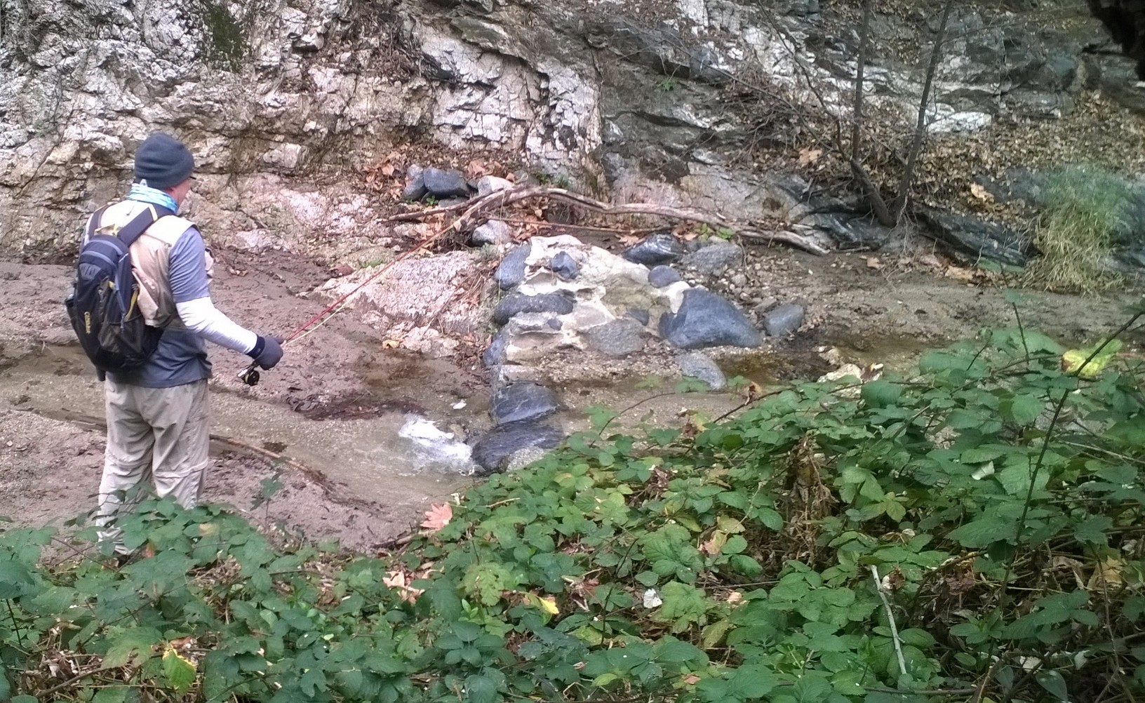 Jim was armed with a nice 3-wt. fiberglass fly rod, Roderick had his trusty 3 wt., and Ansel and I had taken our 4 foot, 2 inch Redington Form game rods — novelty practice rods that actually work great in tight quarters. We also had a small pair of scissors and a container in which to keep any DNA samples we might collect.