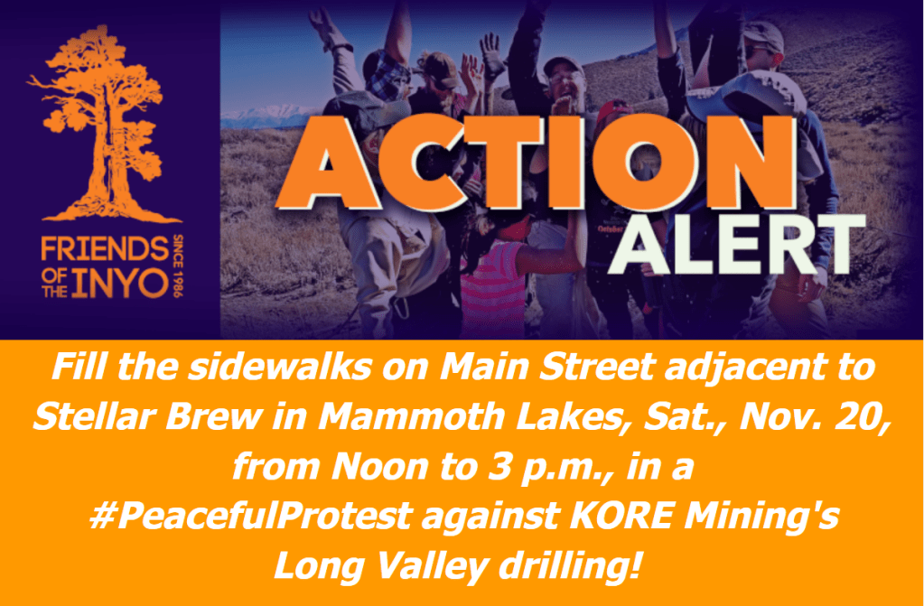 “The goal of this protest is to bring awareness to community members in Mammoth Lakes and the Eastern Sierra about KORE Mining’s intentions to implement an open pit gold mine,” the protest Facebook page says. “We are encouraging folks to make signs and banners in preparation for the event.”