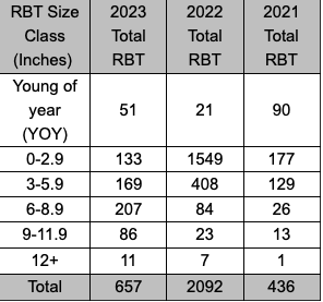 Why the overall drop from 2022 to this year? What’s interesting to me is the precipitous decrease in fry (under 2.9 inches) and the increase of the last three categories.