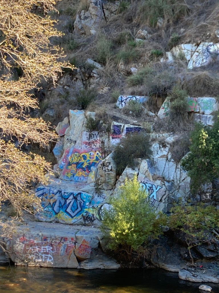 For this story, I contacted multiple agencies to discover their federal and local graffiti policies, and how it is removed from our Monument: the Forest Service, at the local and national level, Public Works, the Conservation Corps, Representative Judy Chu, it was a long list, with nary a substantive response. All I can say is I’m disappointed in the complete lack of transparency from these elected officials and agencies. Meanwhile, when I pass by The Ledge next time I’m going fishing, I’ll think of Han Shan’s beautiful words, not the graffiti no one in authority bothers to take down.