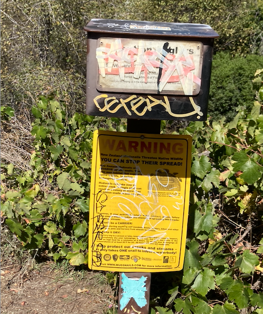 For the two images below, both from the East Fork, the one on the left is the angler fishing box, an integral part of the communication covenant between anglers and the Forest Service. Ranger Ken Low of the National Parks Service said by email, “For the signs, I would try the World’s Best Graffiti Removal Products’s Safewipes. They come in a package with a cloth. Wear a nitrile glove to be safe. For the wayside panel with nothing on it, I would get some matching paint (brown) and repaint over all the graffiti.”