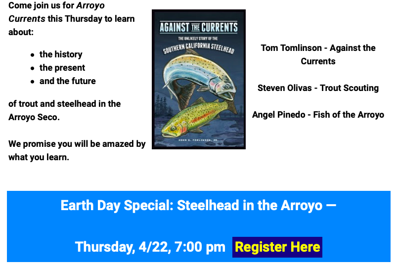 From the Arroyo Seco Foundation: The California Department of Fish & Wildlife has recently listed the Arroyo Seco in the Los Angeles River as a candidate site for its Fisheries Restoration Program. This is the first time anything has ever been listed in the LA River Watershed for steelhead restoration. The Arroyo Seco Foundation has been invited to submit a proposal by April 13.