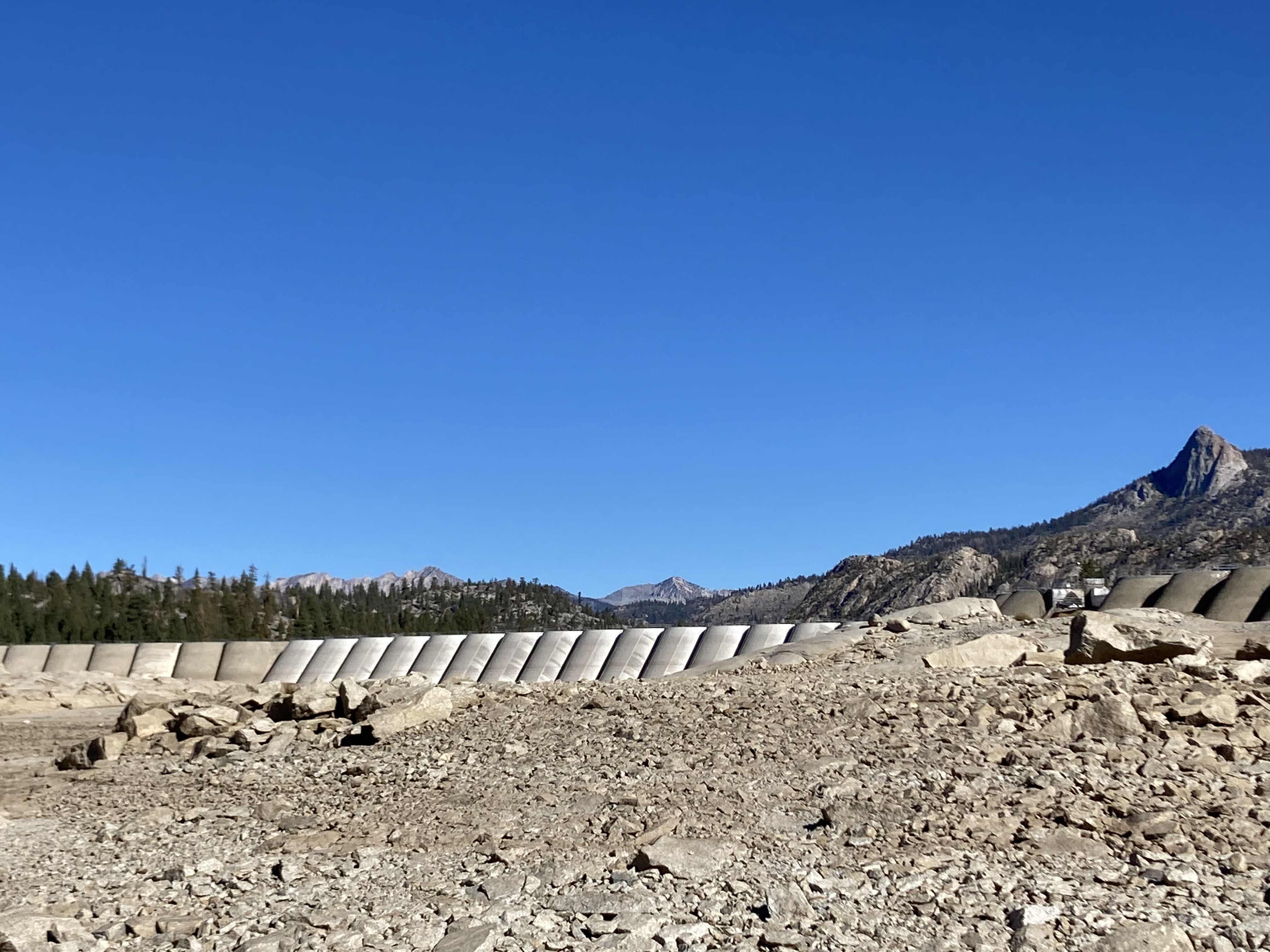 This view of Florence’s Lake’s dam from October, 2021, shows the extent of water loss from the continuing drought. It was built in 1926 as part of a hydroelectric project and captures water from the South Fork of the San Joaquin River in the western Sierra. (Credit: Jim Burns)